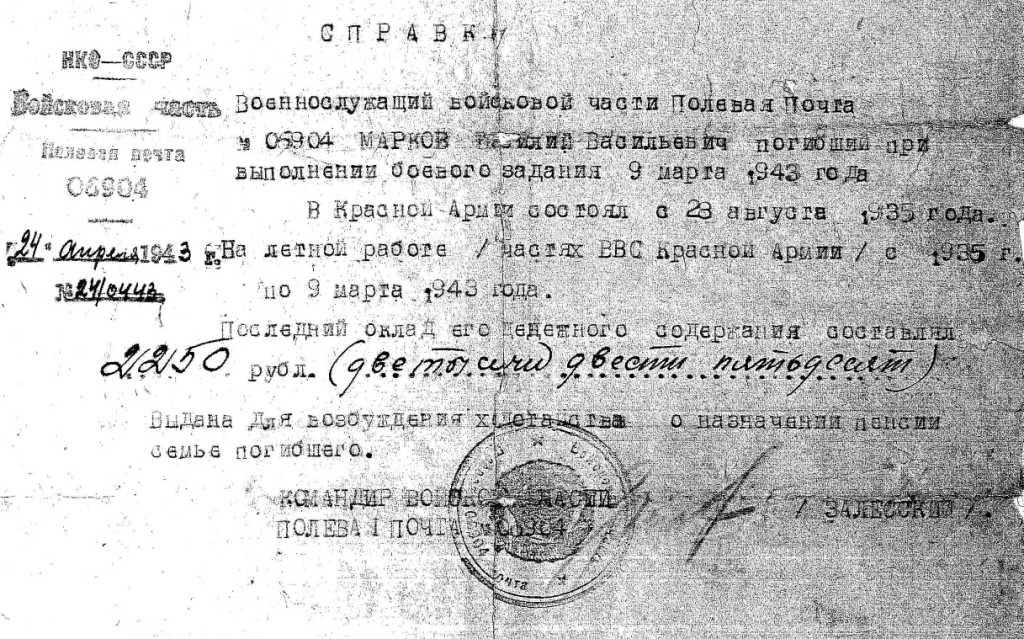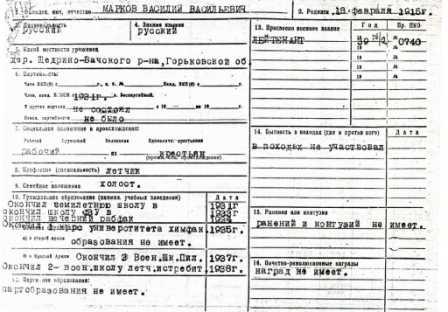 Я вела поиски в разных источниках. Я нашла сведения о Маркове Василии Васильевиче – летчике-истребителе асе, попавшем в книгу Быкова «Асы Великой Отечественной войны», в ряд других книг, а также в Вашем списке выпускников. Но, к великому сожалению, это оказался полный тезка моего деда, в биографии которого другие данные и фотография другого человека.