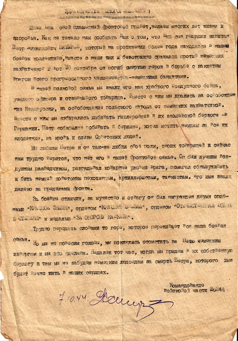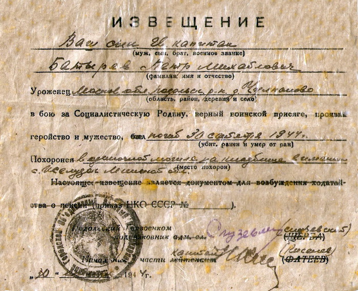 Фотографии и копии документов предоставлены для сайта Ларисой Масловой, внучкой Героя