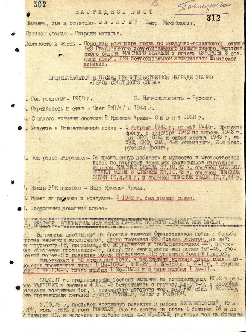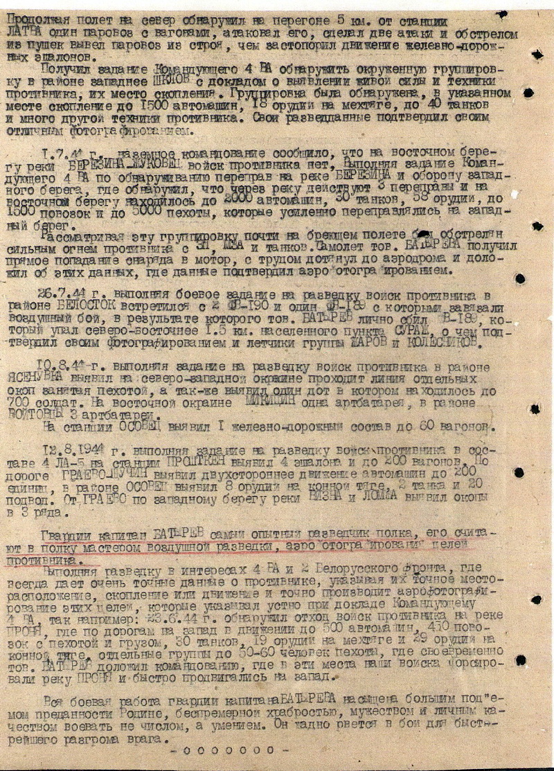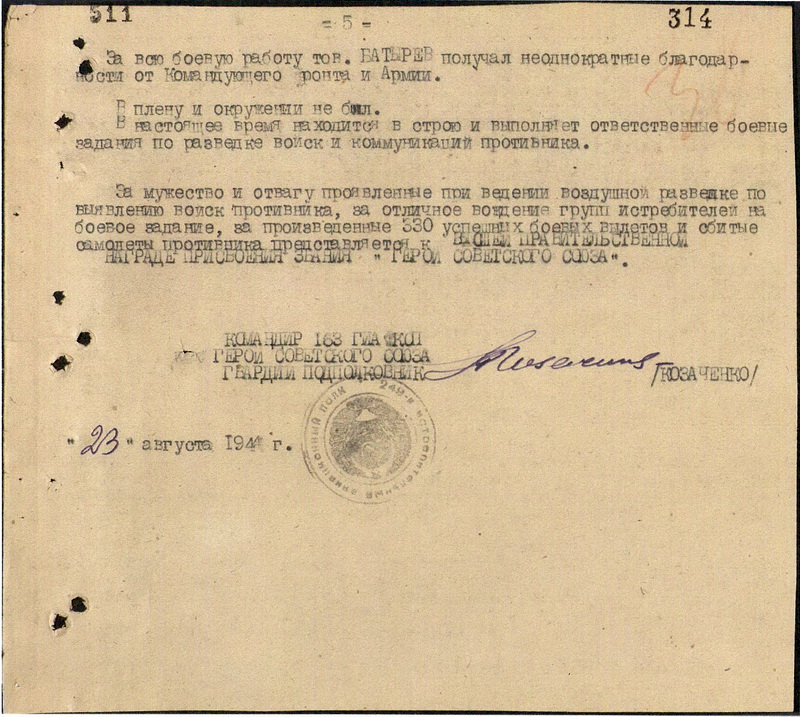 К началу августа 1944 года помощник командира по воздушно-стрелковой службе 163-го гвардейского истребительного авиаполка гвардии капитан П.М. Батырев совершил 330 боевых вылетов, из них 18 на штурмовку и 212 на разведку. Участвовал в 52 воздушных боях, лично сбил 5 самолётов противника и 1 в группе.