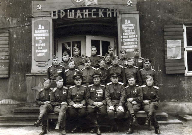 Командир Гвардейского Краснознаменного Ордена Суворова Оршанского Полка Герой Советского Союза подполковник В.И.Сувиров (в первом ряду в центре) среди сержантов 1923-24 г. рождения, подлежащих демобилизации. 10.06.1949 г., Германия.