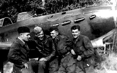 Слева направо: Ф.Г. Кузнецов, В.И. Клименко, И.И. Забегайло, Тихонов у самолета Забегайло. Июль-август 1942 г.