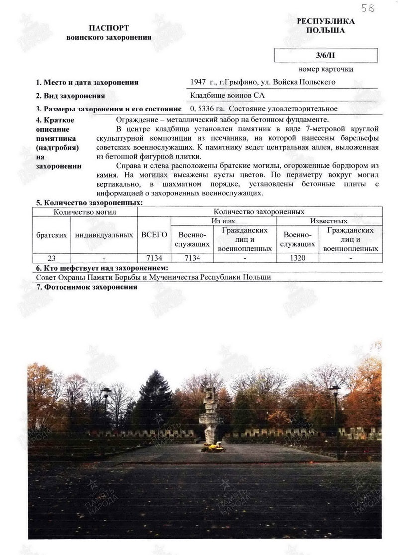 Похоронен он на военном кладбище г. Грыфино, Западно-Поморское воеводство, Польша: