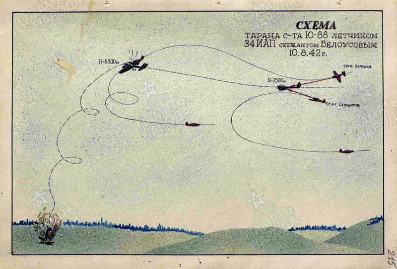 Поняв, что его ожидает, немецкий пилот резко сбавил скорость, надеясь, что атакующий истребитель по инерции проскочит вперед. Однако советский лётчик был начеку и тут же отдал штурвал от себя. Удар винта истребителя пришелся по плоскости, фюзеляжу и кабине вражеского самолета. Поврежденный «Юнкерс» непроизвольно сделал «бочку» и с резким левым креном, в отвесном пикировании стал падать в районе Теряевой Слободы (по данным наградного документа, в районе Старица – озеро Круглое). Кстати, по данным вражеских документов, уже в нынешнее время удалось узнать, что этот Юнкерс-88 был из 4-й эскадрильи 121-й разведывательной группы Люфтваффе. Вообще надо сказать, немецкому экипажу очень повезло: несмотря на повреждения, полученные при таране русского истребителя, пилоту «Юнкерса» удалось произвести посадку на фюзеляж на территории, занятой немецкими войсками...