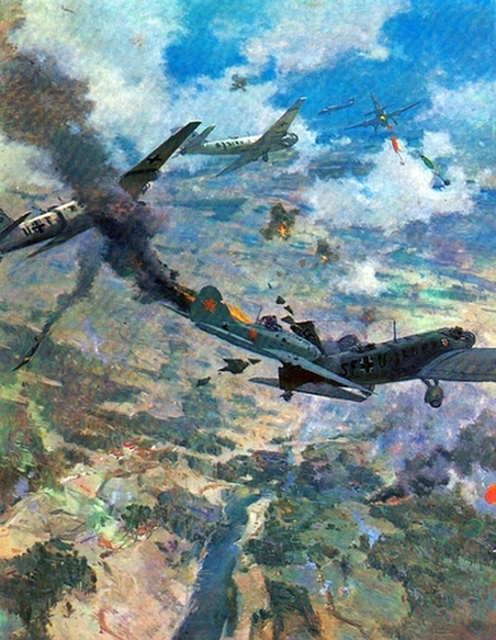 Художник заблуждался. Золотую звезду Героя и орден Ленина лётчик-истребитель П.А. Пологов получил не за этот подвиг, а девятью месяцами ранее…