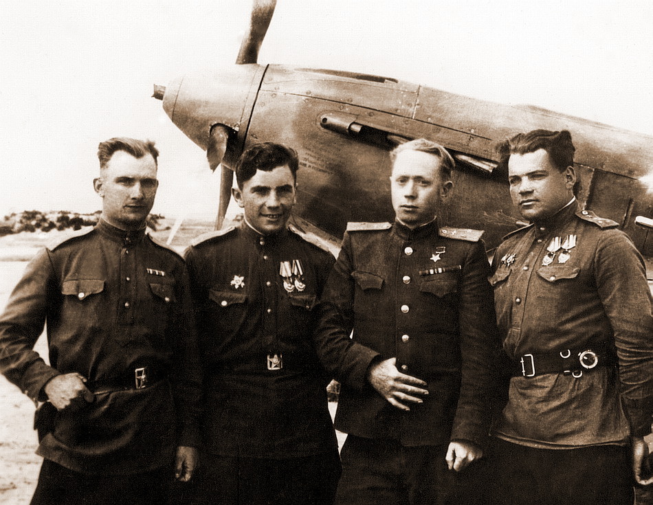 Лётчики-истребители эскадрильи Героя Советского Союза подполковника П.А. Пологова (второй справа)
