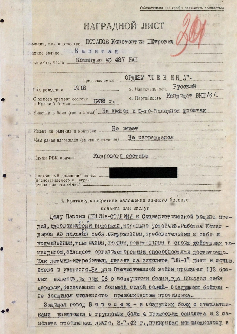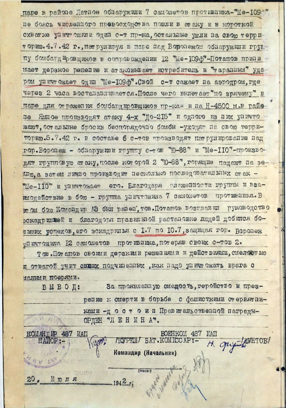 Командир эскадрильи 487-го истребительного авиационного полка (101-я истребительная авиационная дивизия, Воронежско-Борисоглебский дивизионный район ПВО) лейтенант Потапов К. П. 4 июля 1942 года в 13.45 в паре с лейтенантом Ханиповым в районе Воронежа вступил в бой с 6 истребителями противника Me-109F. Вскоре у Ханипова был повреждён мотор и он вышел из боя. Оставшись в одиночестве, Потапов продолжал вести бой. Преследуя "мессершмитт", он израсходовал весь боекомплект и решил пойти на таран. Он увеличил скорость, настиг противника и винтом отрубил ему хвостовое оперение. Вражеский самолёт упал в районе деревни Масловки Воронежской области. Повреждённый самолёт посадил на свой аэродром. Наблюдавший бой член военного совета фронта лично поздравил Потапова и приказал выдать ему партийный билет без кандидатского стажа. За этот подвиг лейтенант Потапов награждён орденом Ленина.