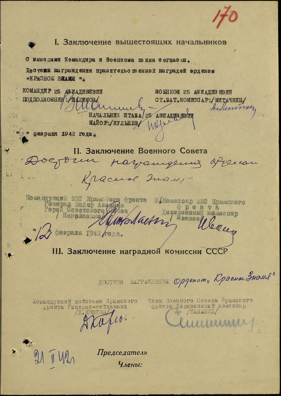В течение февраля-апреля 1942 года Крымский фронт силами трёх армий трижды пытался прорвать оборону противника, развить наступление на Джанкой и Карасубазар и в конечном счёте решить задачу по деблокированию Севастополя. И каждый раз попытка не удавалась. Передовые части натыкались на хорошо организованную оборону противника. Плотный артиллерийский огонь и удары врага с воздуха останавливали наши войска, заставляли их отходить на прежние позиции, зарываться в землю.