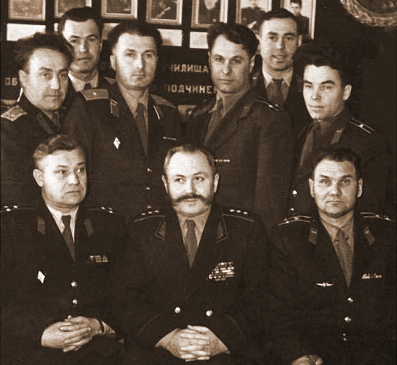 Полковник К.В. Брехов – начальник 1-го Чкаловского военного авиационного училища л`тчиков. С.М. Штеменко в Оренбургском авиационном училище, начало 1960-х. Нижний ряд, слева направо: К.В. Брехов, С.М. Штеменко, И.М. Пошков.