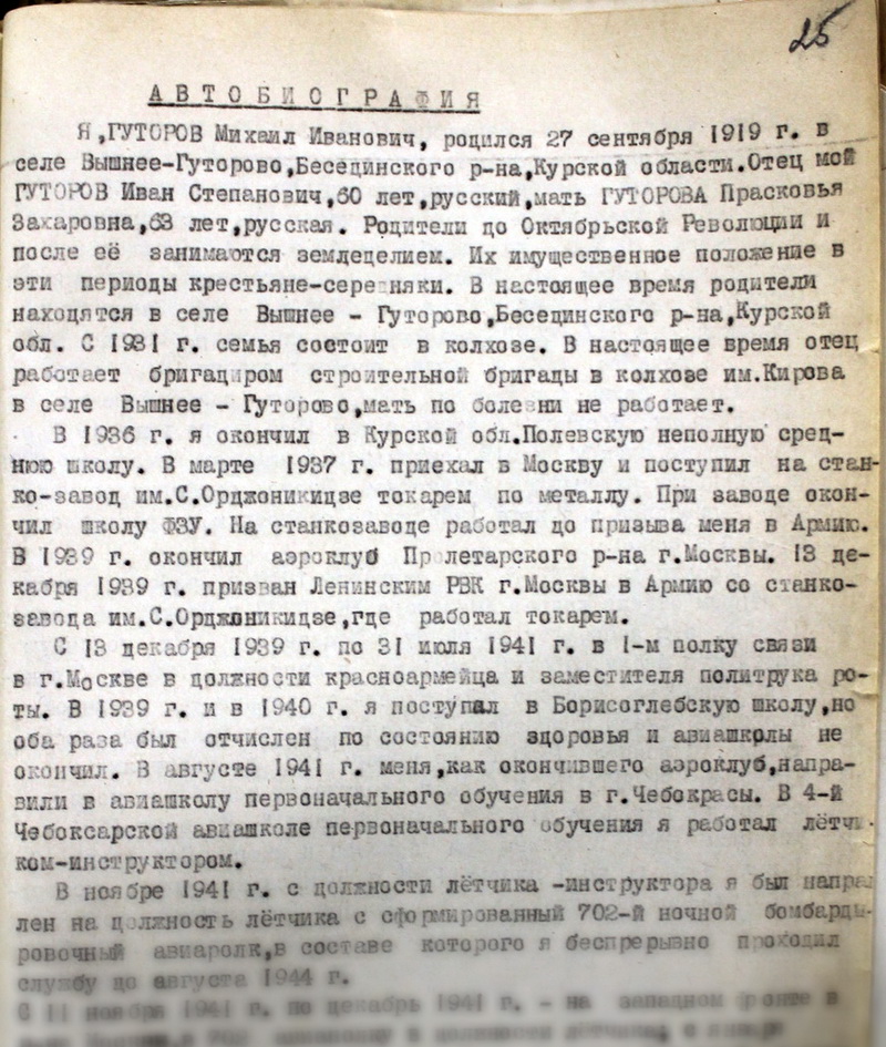 От Администратора сайта. Скорее всего, в автобиографии машинисткой допущены ошибки в дате рождения и названии места рождения Гуторова М.И. Во всех других источниках, в том числе и на памятнике Герою указана дата рождения 24 сентября. А правильное название населённого пункта, в котором родился Гуторов М.И. - Верхнее Гуторово.
