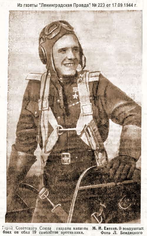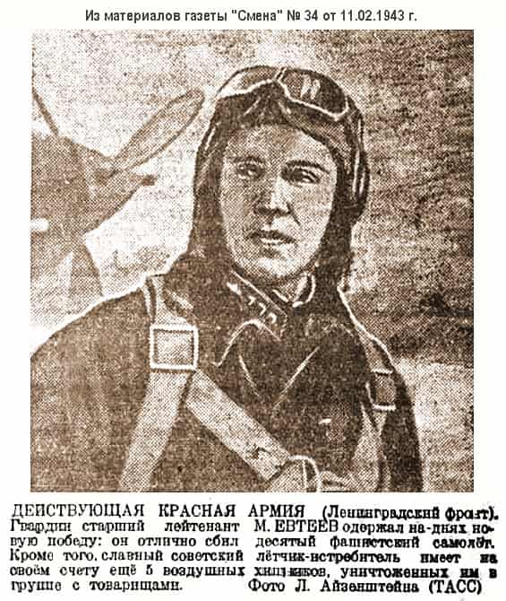 Командир эскадрильи 11-го гвардейского истребительного авиационного полка гвардии капитан Евтеев к июлю 1943 года выполнил 285 боевых вылетов, в 65 воздушных боях лично сбил 10 и в группе 6 самолётов противника.
