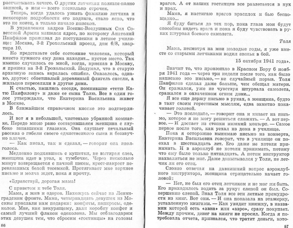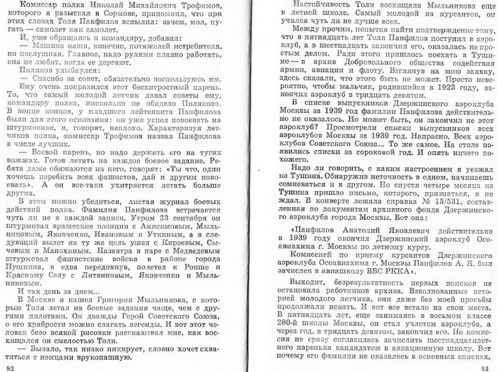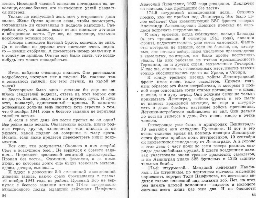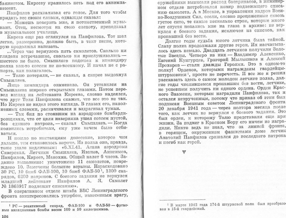 Когда-то достаточно давно я читал книгу про действия авиации Ленинградского фронта в годы войны мне запомнился очерк про мл. лейтенанта Панфилова, покинувшего подбитый Ил-2 и погибшего в бою с гитлеровцами на земле. Мне тогда показалось несколько странным, что лётчик штурмовой авиации, как писал автор, закончил Борисоглебское училище, да и обстоятельства его гибели так же как и поиски, проведенные автором были не совсем обычными , поэтому хорошо запомнил этот случай.