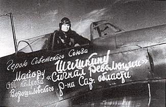 Самолёт ещё не был окрашен. На фюзеляже красовалась одна надпись: "Сталинскому соколу майору Шишкину от колхоза "Сигнал революции" Ворошиловского района Саратовской области". Василий Иванович попросил её изменить и вместо "Сталинскому соколу" написали "Герою Советского Союза".