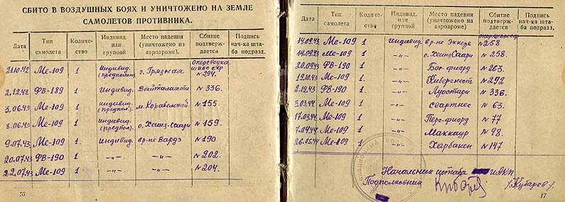 - Было. В одном вылете двух сбил. Как я вам расскажу? Я зашел, сманеврировал, гляжу - он идет на бомбера, я подстроился, раз, ударил и все. Как можно рассказать!? Это же воздушный бой, такая карусель, чтобы голова крутилась на 360. Главное, в воздушных боях видеть, где противник. Вот в этом вылете было два боя. Сначала в одном районе, а потом, когда возвращались, нас перехватили, начался еще воздушный бой. Вот два «мессера» сбил в одном бою.