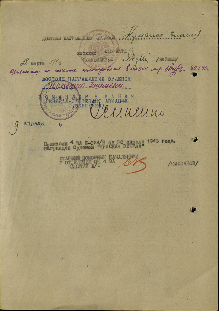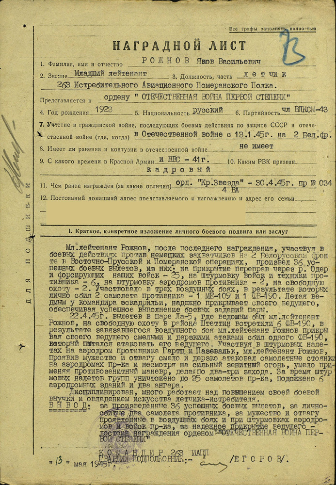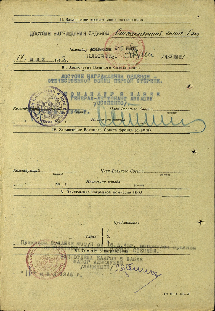 Ну следующий день утром в 10 часов митинг – все вперед!! Это был Второй Белорусский фронт, командовал им Рокоссовский, главной задачей было выйти к Балтийскому морю, отсечь Пруссию, а 4 ВА прикрывала его, командовал ей Вершинин, я был в 8 корпусе, командир корпуса генерал-лейтенант Осипенко, в Испании воевал, а брат у него майор, был начштаба нашего полка.Вот с этого началась моя настоящая боевая работа. И с этого дня каждый практически день я участвовал в боевых вылетах до конца войны.