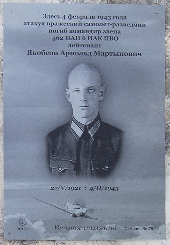 После кропотливых и непростых поисков в ЦАМО удалось найти запись об упавшем рядом с Никоновским истребителе, пилотируемом лейтенантом Якобсон Арнольдом Мартыновичем.