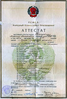 Аттестат Капустина М.М. об окончании средней школы