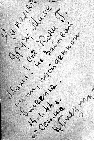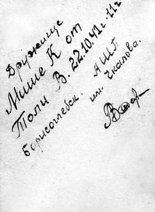 Фотография, которую мама послала своей маме, Елене Ивановне Кучуре, с надписью на обороте, сделанной Капустиным М.М.: «Дорогая Елена Ивановна! Может быть, меня Вы больше не увидите, но вот на этом фото мы с Галюськой. Кечкемет, Венгрия, Михаил К. 3.I.45 г.»: