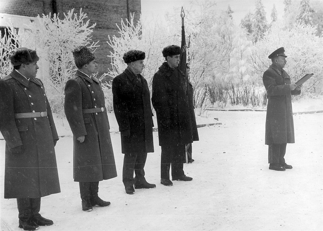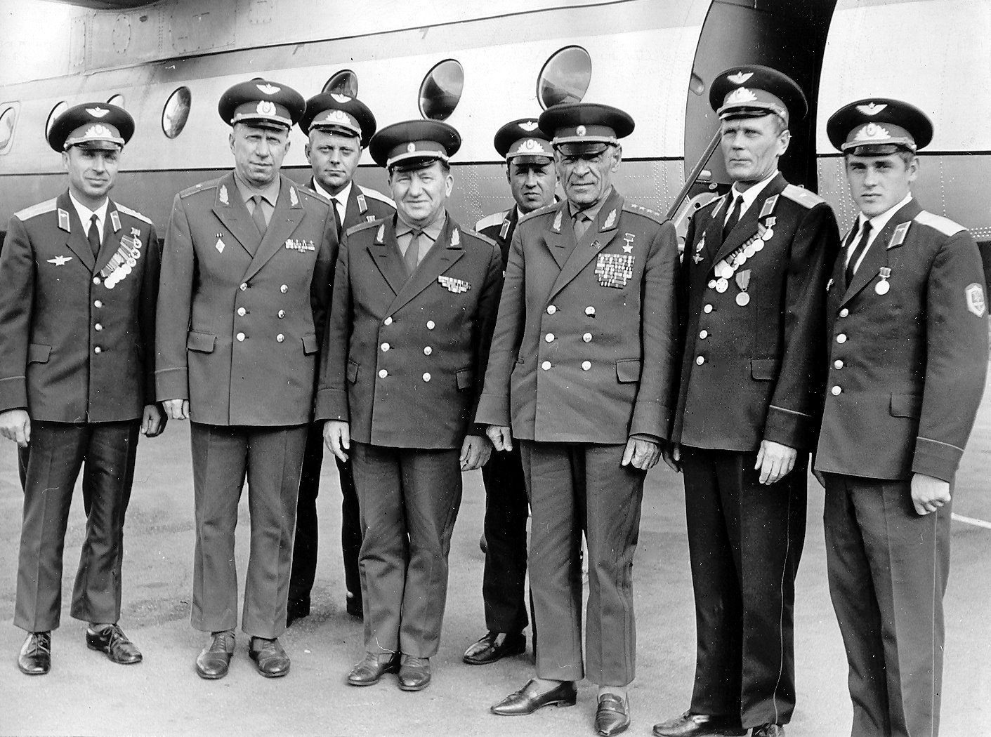 Третий справа - командующий Прибалтийским военным округом генерал армии Хетагуров Г.И., второй слева - Капустин М.М., второй справа - Конарев Юрий Дмитриевич, командир военного самолёта, перевозившего на протяжении многих лет Хетагурова Г.И. (информация о Конареве Ю.Д. предоставлена Евгением Конаревым, внуком Конарева Ю.Д.),четвёртый слева - Иванов Михаил Терентьевич, начальник штаба Прибалтийского военного округа. Иванов М.Т. окончил ВАГШ с золотой медалью в 1952 году, защитил кандидатскую диссертацию в 1972 году. После увольнения в запас с 1972 года по 1983 год работал директором Латвийского республиканского архива кино-фото-фоно документов. Ушёл из жизни 07 июля 1983 года. Информация об Иванове М. Т. предоставлена Людмилой Михайловной Коноплёвой (Ивановой), дочерью Иванова М. Т.).