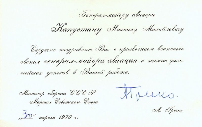 Поздравление Министра обороны СССР Гречко А.А. с присвоением звания генерал-майора авиации, 30 апреля 1970 г.