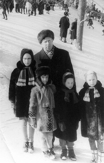 Во время прогулки по Ленинским горам рядом с трамплином с дочерьми, своими и сокурсников ВАГШ, Москва, 1964 г.