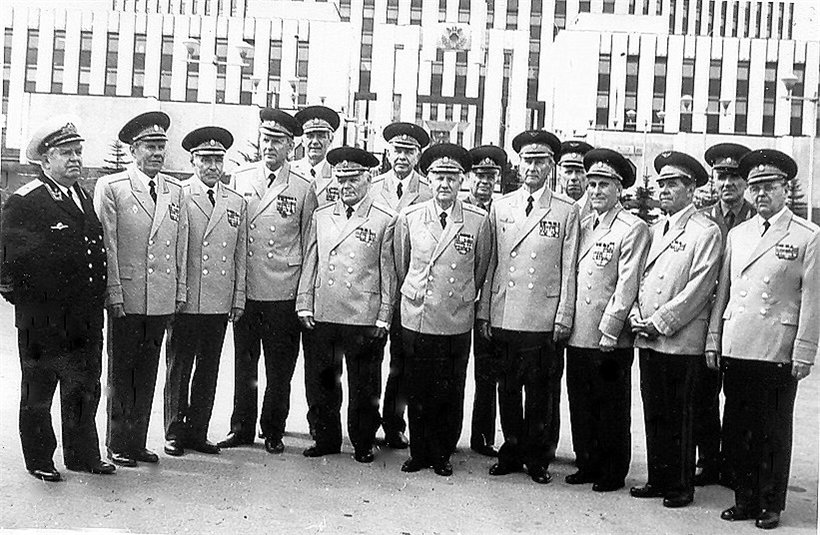 Преподаватели кафедры ОИ ВВС на одном из совещаний в п. Монино (Московская область) с маршалом авиации Пстыго И.И. (сидит четвёртый слева), 2 октября 1978 г.