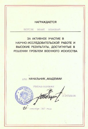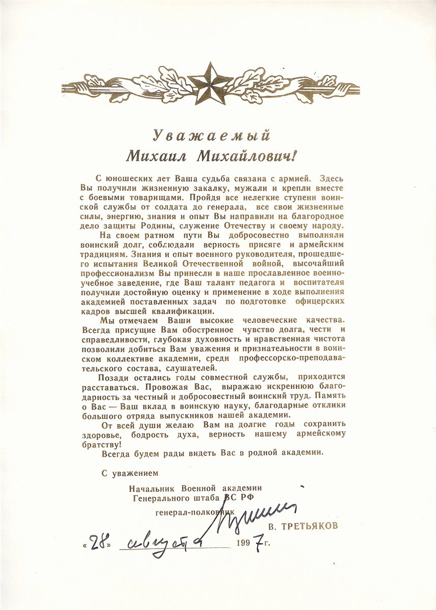Благодарность командования при увольнении из ВАГШ, 28 августа 1997 г.: