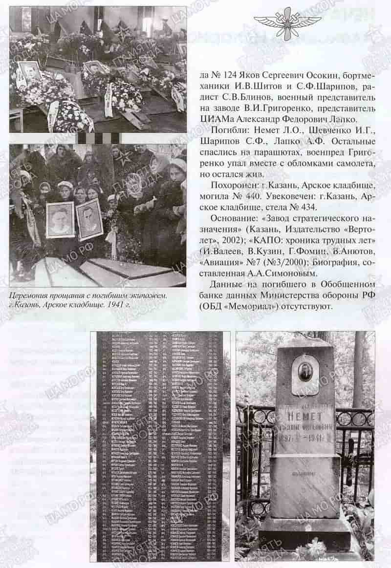 Пятерым членам экипажа удалось благополучно покинуть горящую машину на парашютах, трое - Шевченко, Шарипов, Лапко - погибли. На выводе из спирали бомбардировщик стал разваливаться, Немет прыгнул последним на высоте 600 метров. На нём горела одежда и, скорее всего пламя повредило парашют - купол раскрылся и тут же, обмякнув, ушёл в сторону, Немет погиб. Удивительна судьба военпреда Григоренко. Понимая, что сквозь пламя ему не выпрыгнуть, он собрал все брезентовые чехлы с двигателей, перебрался в самый хвост самолёта, завернулся в них и при ударе самолёта о землю остался жив, получив незначительные ушибы.
