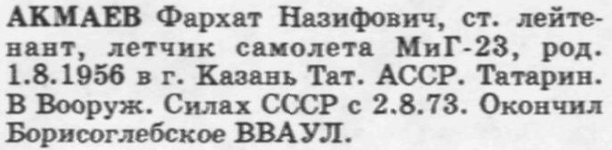 В приведённом выше источнике содержатся неточности. В 217 апиб, где служил Акмаев Ф.Н. (Кизыл-Арват), не было самолетов МиГ-23. В другом источнике по-другому изложены и обстоятельства гибели лётчика.