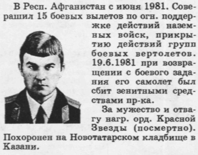 "...19 июня 1981 г., боевая потеря самолета Су-17, 217 апиб (Кизыл-Арват), вылет с аэродрома Шиндант, пара: ведущий старший летчик ст. л-нт Акмаев Фарид, ведомый Галущак. Вылет на разведку противника в заданном районе. Выполняя полет на предельно-малой высоте в 6.30 утра по Кабульскому времени, ведущий видимо был ослеплен восходящим солнцем и зацепил за бархан. Самолет взорвался, летчик погиб. Ведомый выполнял полет с превышением и успел уйти от столкновения..."