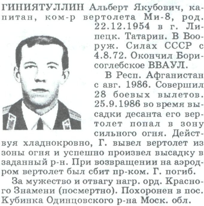 "...25 сентября 1986 г. боевая потеря вертолета Ми-8мт 335 обвп (Джелалабад). Экипаж к-на А.Гиниятулина осуществлял высадку десанта в районе кишлака Шикадан провинции Нангархар. Возвращаясь с задания, уже на подходе к аэродрому Джелалабад, был поражен двумя ракетами ПЗРК "Stinger" (первый летательный аппарат сбитый этим типом ПЗРК в Афганистане). Борт взорвался в воздухе. Командир экипажа и борттехник л-т О.Шебанов погибли, а летчик-штурман Николай Гернер был выброшен взрывной волной и остался жив/ (Поисковый отряд нашел место падения только на следующий день, хотя место крушения находилось недалеко от аэродрома)..."