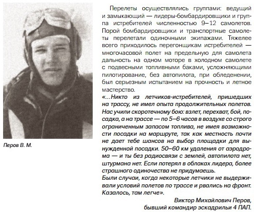 Летом 1942 года летчик Перов попал в Иваново в формирующуюся полковником И.П. Мазуруком, известным полярным летчиком, Героем Советского Союза, перегоночную авиадивизию, и был назначен в Якутск командиром авиаэскадрильи 4-го перегоночного авиаполка Красноярской воздушной трассы, протянувшейся на 6,5 тысяч километров с Аляски через Берингов пролив над самыми суровыми и необжитыми на планете местами. Воздушный мост стал настоящим испытательным полигоном и для крылатых машин, и для людей. Ведь никто в мире ничего подобного не делал. В тесной кабине, мало спасающей от 50-градусного мороза, в не приспособленных к длительным перелетам истребителях приходилось преодолевать огромные расстояния, прекрасно понимая, что в случае чего на вынужденную посадку идти некуда.