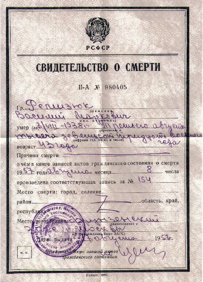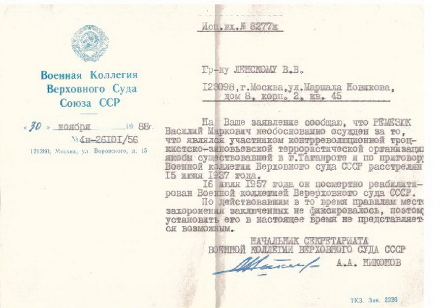 ...П-14059 Ремезюк Василий Маркович, 1895 года рождения, уроженец г. Севастополя, до ареста работавший начальником авиаслужбы Наркомтяжпрома. 15 июня 1937 года выездной сессией Военной Коллегии Верховного Суда Союза ССР приговорен по ст.ст. 58-8 и 58-11 УК РСФСР к ВМН - расстрелу с конфискацией всего лично принадлежащего ему имущества. Приговор приведен в исполнение 15 июня 1937 года. Определением Военной Коллегии Верховного Суда СССР от 16 июня 1957 года приговор в отношении Ремезюк В.М. по вновь открывшимся обстоятельствам отменен и дело о нем производством прекращено за отсутствием состава преступления.