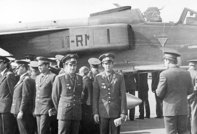 Капитаны Десницкий А. А. и Белоусов Ю. Ф. на фоне французского истребителя-бомбардировщика «Ягуар».