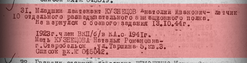 13 октября 1944 года с боевого задания из района Инстербурга не вернулся экипаж: лётчик младший лейтенант А.И. Кузнецов, лётчик-наблюдатель младший лейтенант А.А. Перминов, стрелок-радист младший сержант Т.С. Сергеев.
