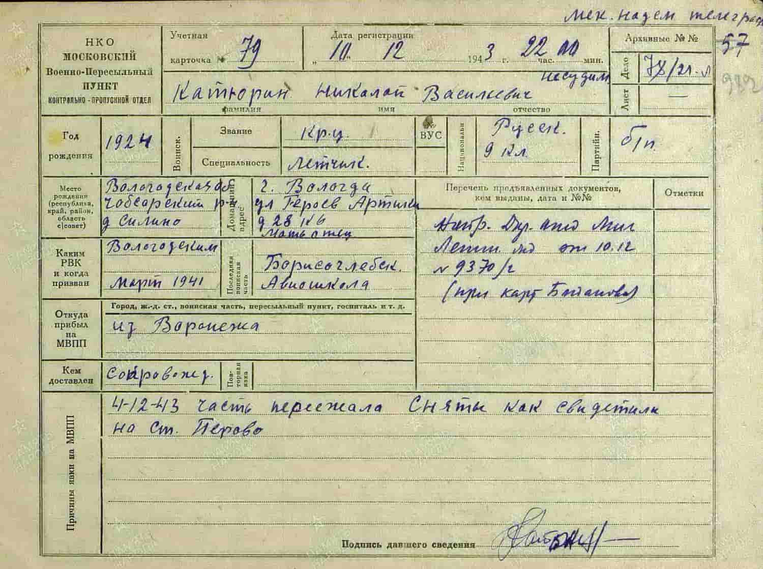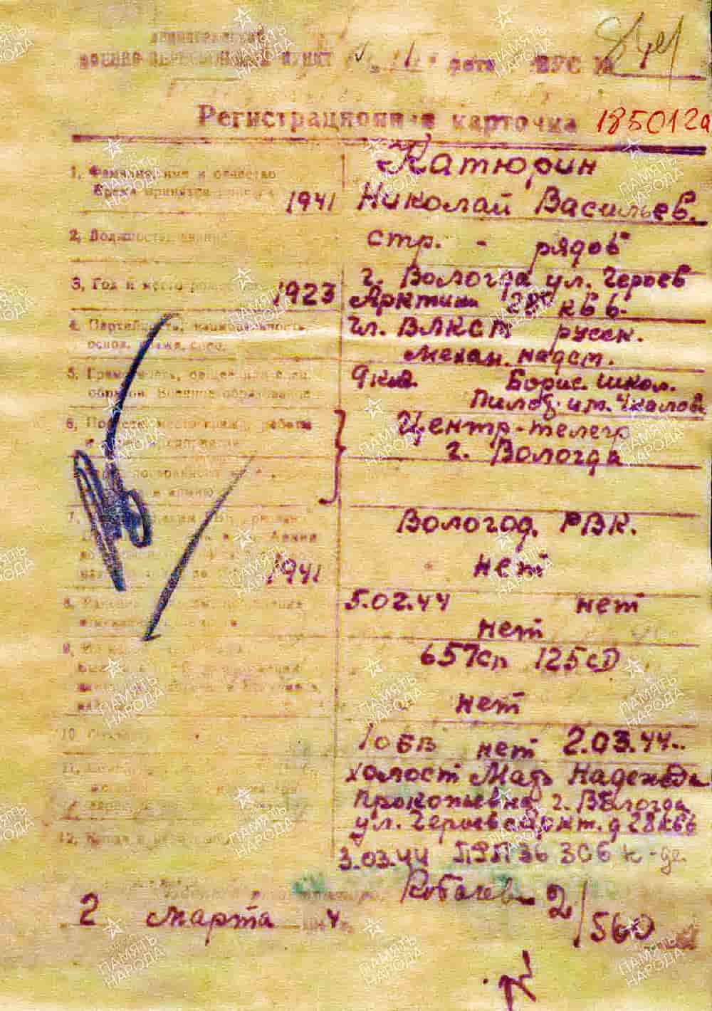 Персональная страница Катюрина Н.В. была создана 10/03/2011 12:23:28. После получения нами из архивов списков выпускников 1943 года Катюрина Н.В. в них не оказалось. Проверяя достоверность информации, опубликованной ниже, оказалось, что ссылки на источник, откуда была взяты сведения для страницы, нерабочие. Поиск в интернете других источников, подтверждающих (или опровергающих) принадлежность воина к Борисоглебской ВАШП результатов не дал. Однако, рассматривая документы, выложенные на портале интернет "Память народа", удалось найти свидетельства того, что Катюрин Николай Васильевич действительно учился в Борисоглебской ВАШП, но по невыясненной причине обучение не завершил и был переведён в сухопутные войска.