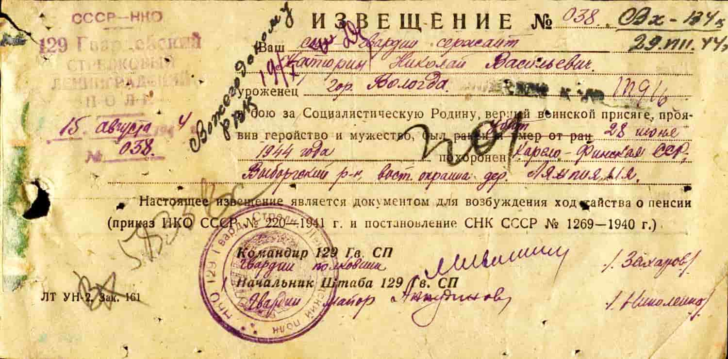Похоронен 1 км восточнее деревни Леитино, Выборгского района Карело-Финской ССР