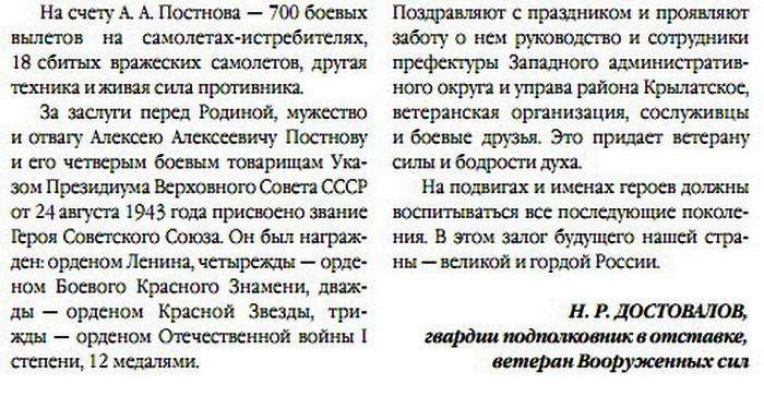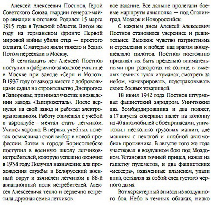 Командир эскадрильи 88-го истребительного авиационного полка (229-я истребительная авиационная дивизия, 4-я воздушная армия, Северо-Кавказский фронт) старший лейтенант Алексей Постнов к июлю 1943 года совершил четыреста пятьдесят семь успешных боевых вылетов, в ста тридцати шести воздушных боях сбил лично семь и в составе группы три вражеских самолёта.