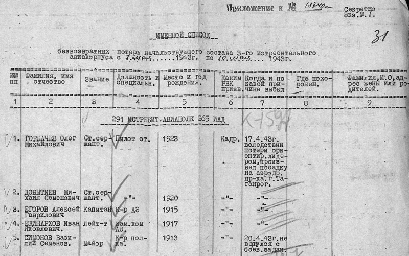 Надо сказать, что в описании событий 17 апреля 1943 г. остается ещё ряд не до конца ясных моментов. Начнем с того, что, судя по приказу № 0318 и воспоминаниям, 17 апреля над Таганрогом 291-й ИАП потерял шесть истребителей, но в документах о безвозвратных потерях 265-й ИАД указаны имена и фамилии только пяти летчиков которые "вследствие потери ориентировки лидером, произвели посадку на аэродром противника, г. Таганрог". Кроме Егорова и Единархова, это старшие сержанты Горбачев Олег Михайлович, Добытеев Михаил Семенович и Богатырев Вячеслав Константинович (на всех трех сержантов были уже поданы документы на присвоения воинских званий "младший лейтенант", которые им присвоили уже после событий 17 апреля - 8.05.1943 г.).