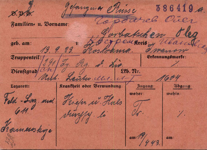 В этой карточке военнопленного уже наш писарь-переводчик допустил ошибку, указав полк не истребительным, а стрелковым. Наверное не знал, что "Jg" - jager, а "Inf" - infanterie. Правильно: мл. л-т Горбачев Олег, 291-й истребительный полк, родился 13.09.1923 в Костроме Ивановской обл., доставлен в лазарет 19.04.1943.