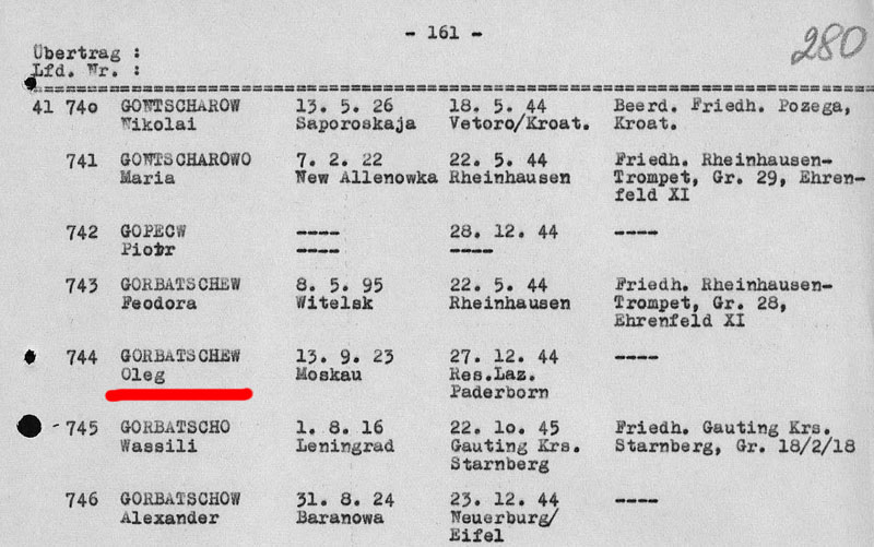 По следующему документу Горбачев Олег умер в резервном лазарете Падерборн 27.12.1944: