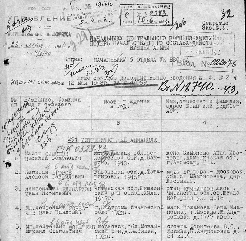 Донесение о потерях 291-го ИАП: