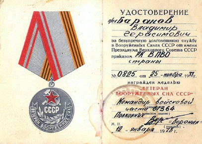 25 ноября 1977 года – Ветеран Вооружённых Сил СССР.