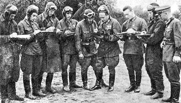 Командир полка С. И. Орляхин ( 4-й справа ) уточняет полётное задание.