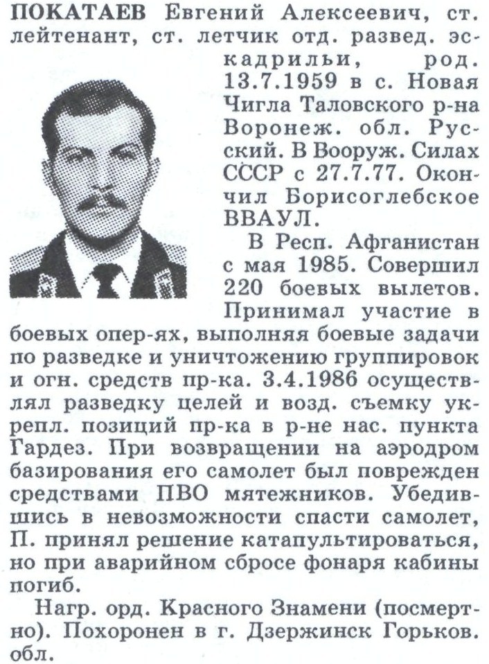 Свой интернациональный долг по защите апрельской революции в Демократической Республике Афганистан старший лейтенант Покатаев Е. А. выполнил с достоинством и честью.