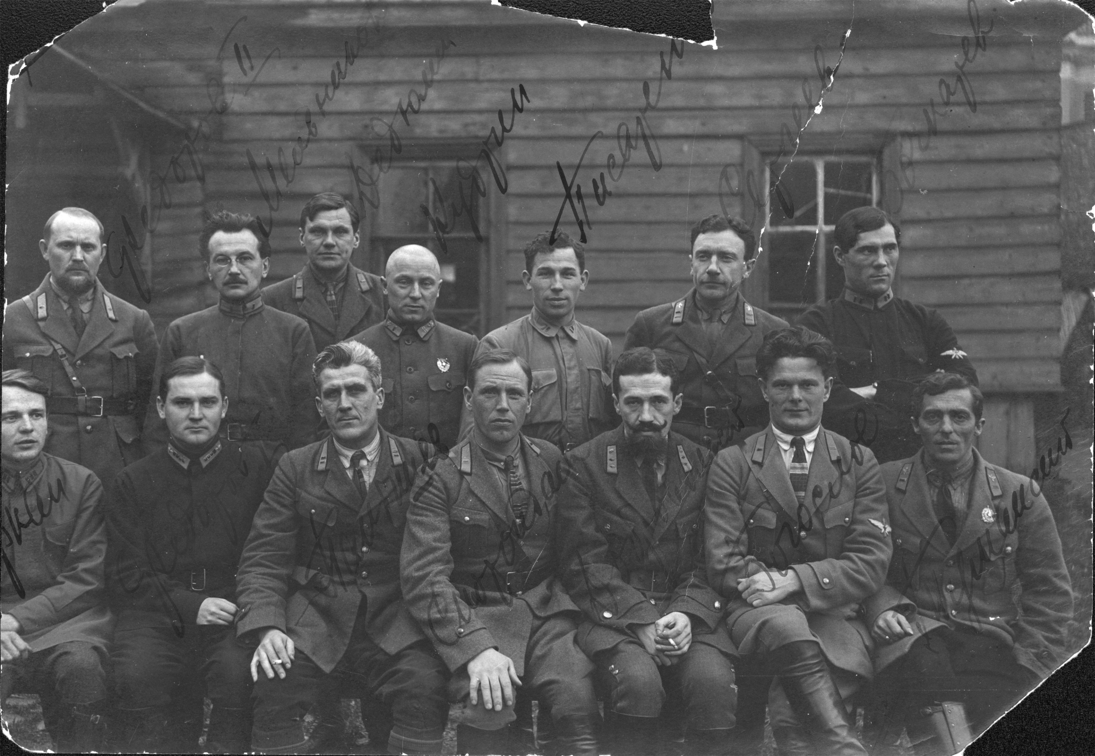 Слева направо. Сидят: неизв. (обрезана подпись), Федоров I, Панышев (Василий Иванович – ранее командир 31 авиационной эскадрильи), Скорондаев, Добровольский (Н.И.?), Богослов (Иван Ефремович), Туманский (Алексей Константинович); Стоят: Федоров II, Мельников, Дедюлин (Александр Григорьевич, командир авиационной эскадрильи научно-испытательного института ВВС РККА, арестован в 1937, расстрелян 1938 г.), Кудрин (Борис Николаевич), Писаренко, Сергеев (Виктор Дмитриевич?), Бочкарев.