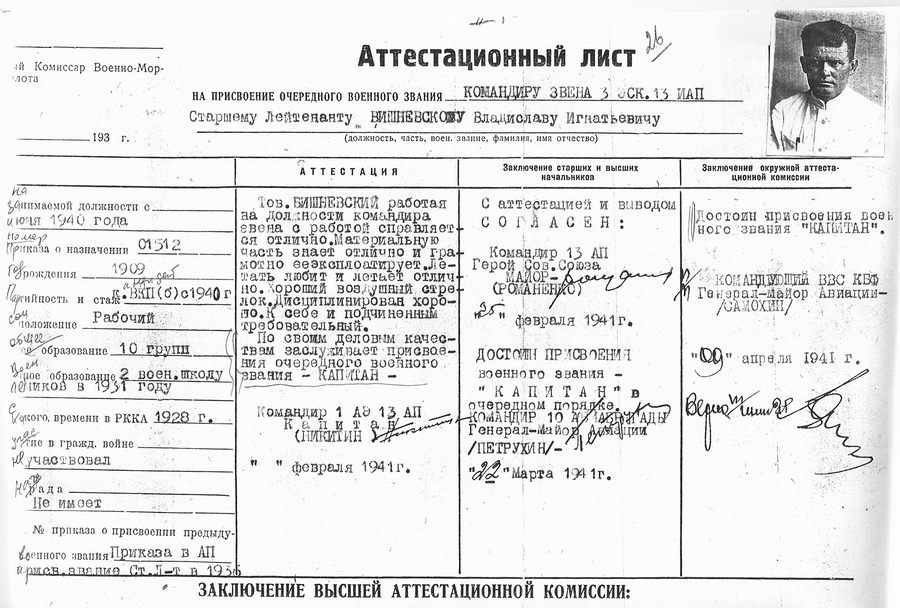 25 февраля 1941 старший лейтенант Вишневский В.И., командир 3-й эскадрильи 13 ИАП КБФ проходит аттестацию с отличной характеристикой, и 9 апреля 1941 году ему присваевается звание "капитан". В аттестационном листе на присвоение этого звания, утверждённом командиром 13 авиаполка Героем Советского Союза майором Романенко и командиром 10 авиабригады генерал-майором авиации Петрухиным отмечалось: «Тов. ВИШНЕВСКИЙ работая на должности командира звена с работой справляется отлично. Материальную часть знает отлично и грамотно эксплуатирует. Летать любит и летает отлично. Хороший воздушный стрелок. К себе и подчиненным требовательный».