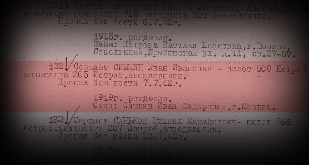 Пилот 508 иап сержант Симкин И.И. погиб 7 июля 1942 года - не вернулся с боевого задания. Числился пропавшим без вести. Останки лётчика были обнаружены поисковиками в августе 2011 года.