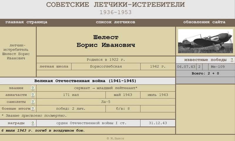 Лётчик 171 иап 315 иад 15 ВА сержант (в наградном листе младший лейтенант) Шелест Борис Иванович погиб 6 июля 1943 года в воздушном бою над Тульской областью.