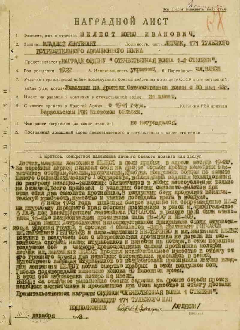 Где служил, в какие годы: Участник Великой Отечественной войны. В 1943 году служил в 171 иап 15-й воздушной армии