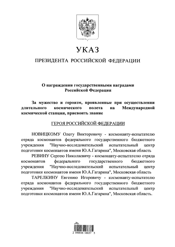 28 мая 2014 года Президент РФ Путин В.В. подписал указ № 374 "О награждении государственными наградами Российской Федерации":